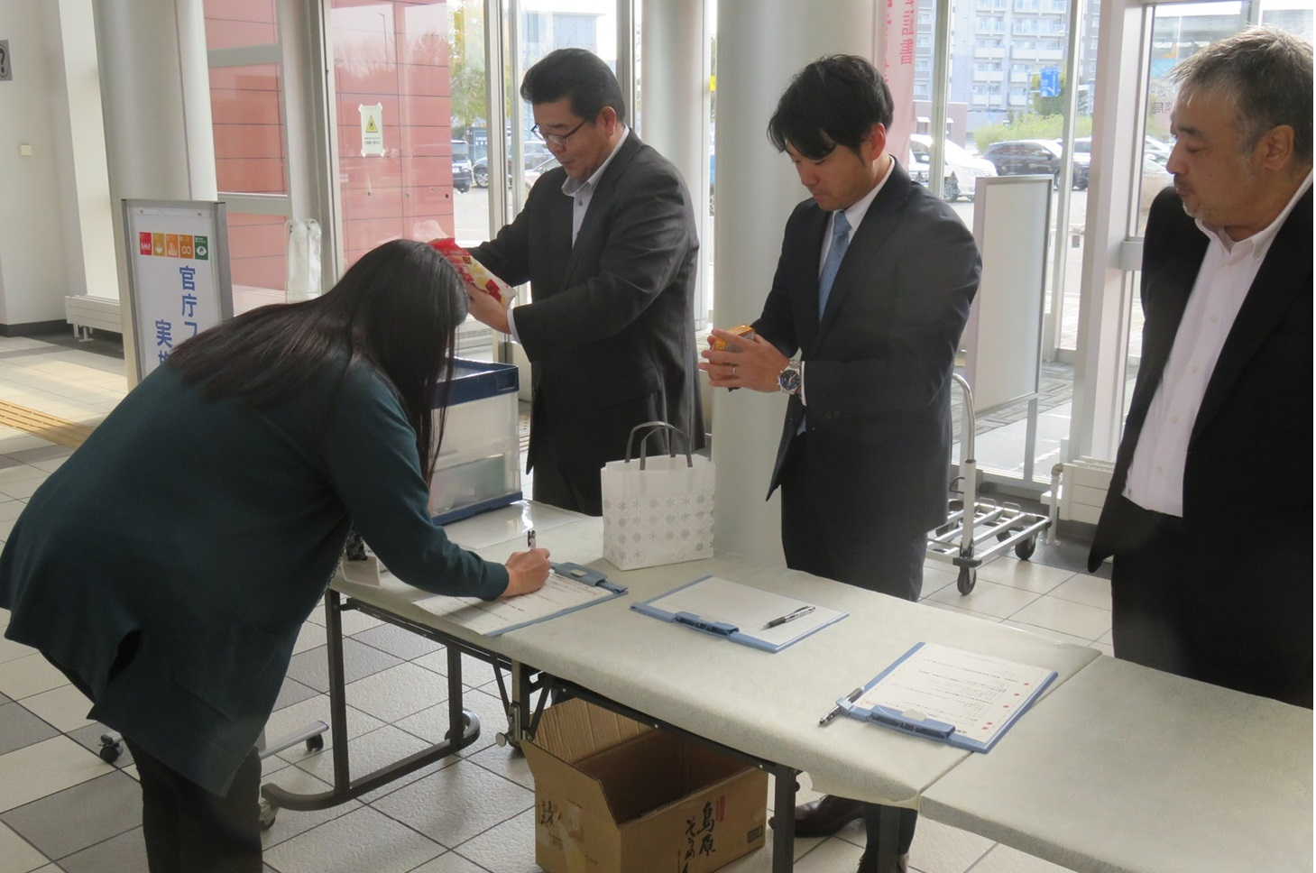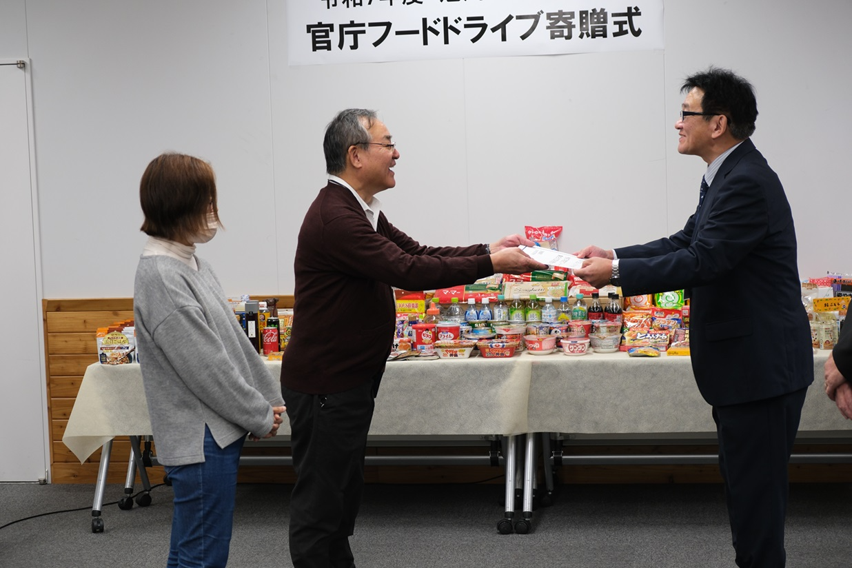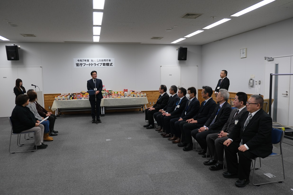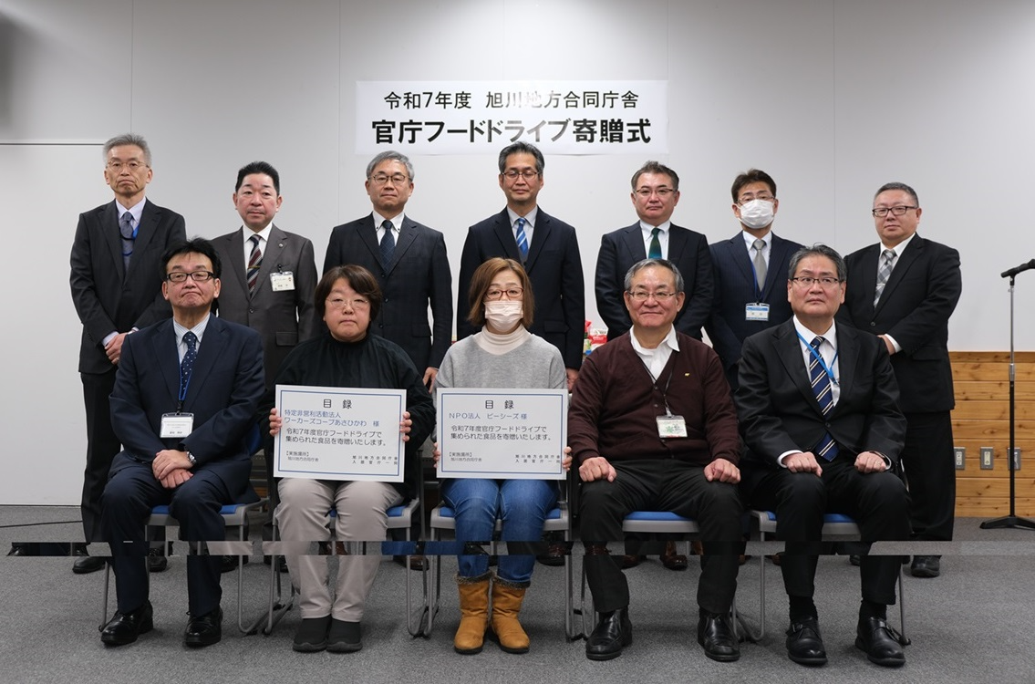 集まった食品については11月4日、旭川市内のフードバンク活動団体である「NPO法人ピーシーズ」、「特定非営利活動法人ワーカーズコープあさひかわ」の2団体に対し、各官庁の代表者とともに寄贈しました。