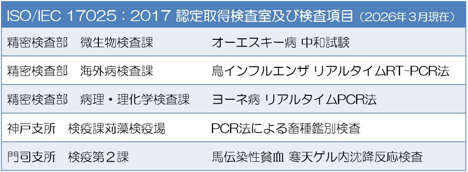 平成24年2月に精密検査部微生物検査課が、家畜衛生分野では国内で初めて試験所認定制度の国際規格であるISO/IEC 17025:2005の認定を取得しました。さらに、ISO/IEC 17025が2017年に改訂されたことから、移行審査を経て令和2年2月にISO/IEC 17025:2017の認定を取得しました。令和8年3月現在、5検査室で認定を取得しています。詳細については、認定証をご覧ください。
