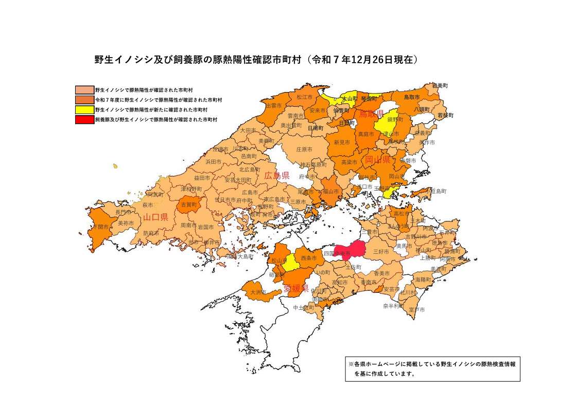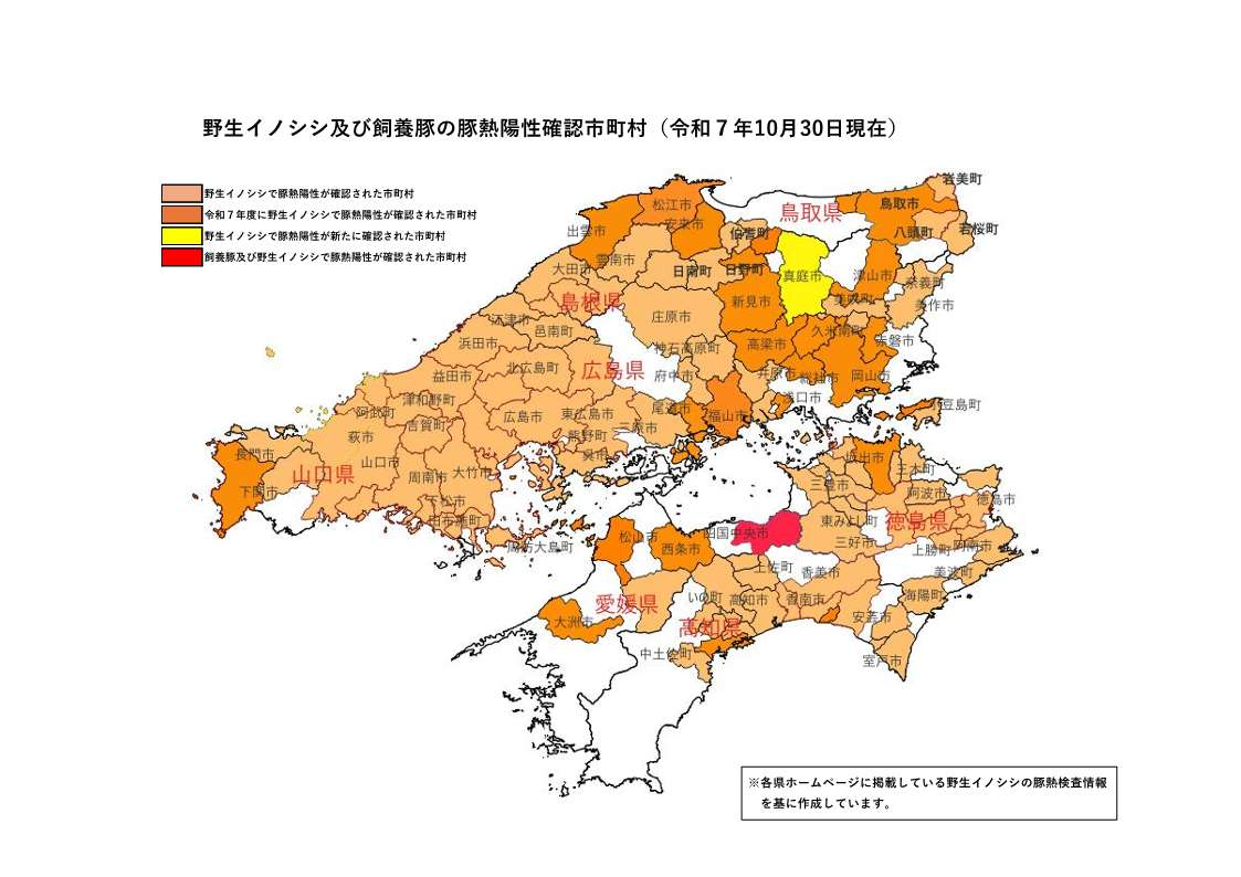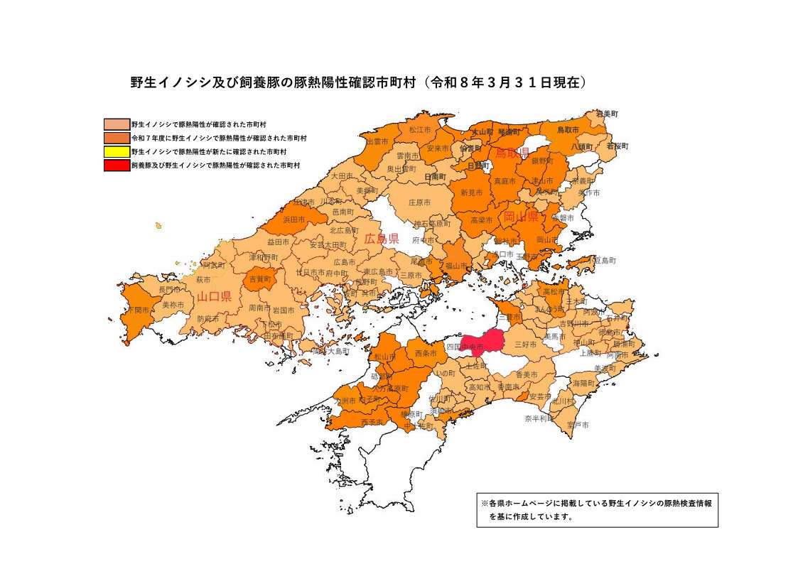 中国・四国地域の野生イノシシにおける豚熱陽性確認市町村