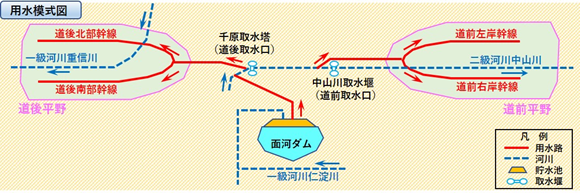 近代では、瀬戸内の寡雨地帯に属するため水資源に恵まれない、といった立地条件を克服し農業経営を安定させるため、昭和32(1957)年~昭和42(1967)年に国営道前道後平野農業水利事業によって面河(おもご)ダムや中山川取水堰などが築造され、道前・道後の両平野13,000ヘクタールを潤す端緒が開かれました。この事業後も、地下水位の低下や営農形態の変化にも対応するため、後継の国営事業(二期事業)が平成元(1989)~平成25(2013)年に行われ、道前平野側に志河川(しこがわ)ダム、道後平野側に佐古(さこ)ダムが築造されたことで、面河ダムと連携した用水供給が可能となりました。