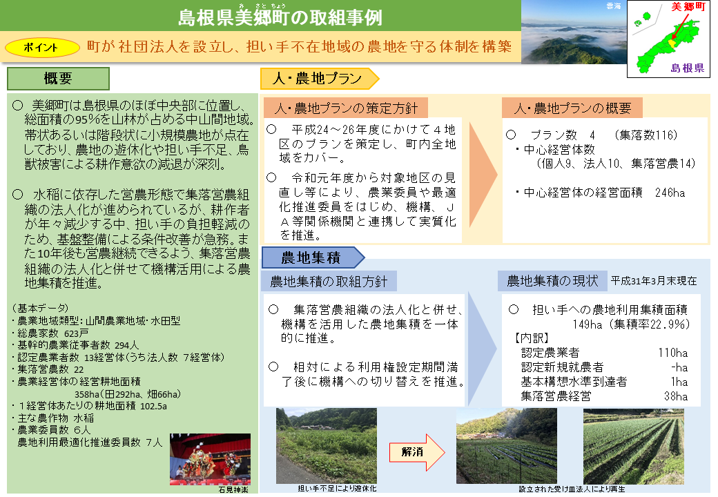 | 島根県 | 美郷町 | 町が社団法人を設立し、担い手不在地域の農地を守る体制を構築 | ![]() 取組事例(PDF : 364KB) |