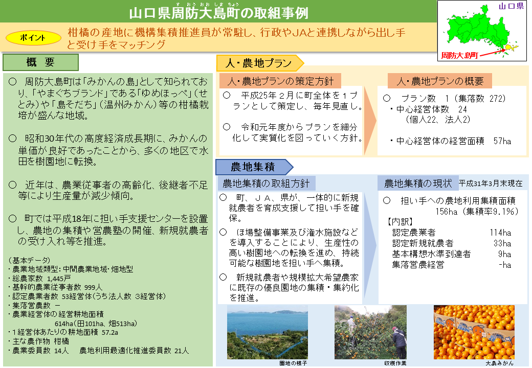 | 山口県 | 周防大島町 | 柑橘の産地に機構集積推進員が常駐し、行政やJAと連携しながら出し手と受け手をマッチング | ![]() 取組事例(PDF : 279KB) |