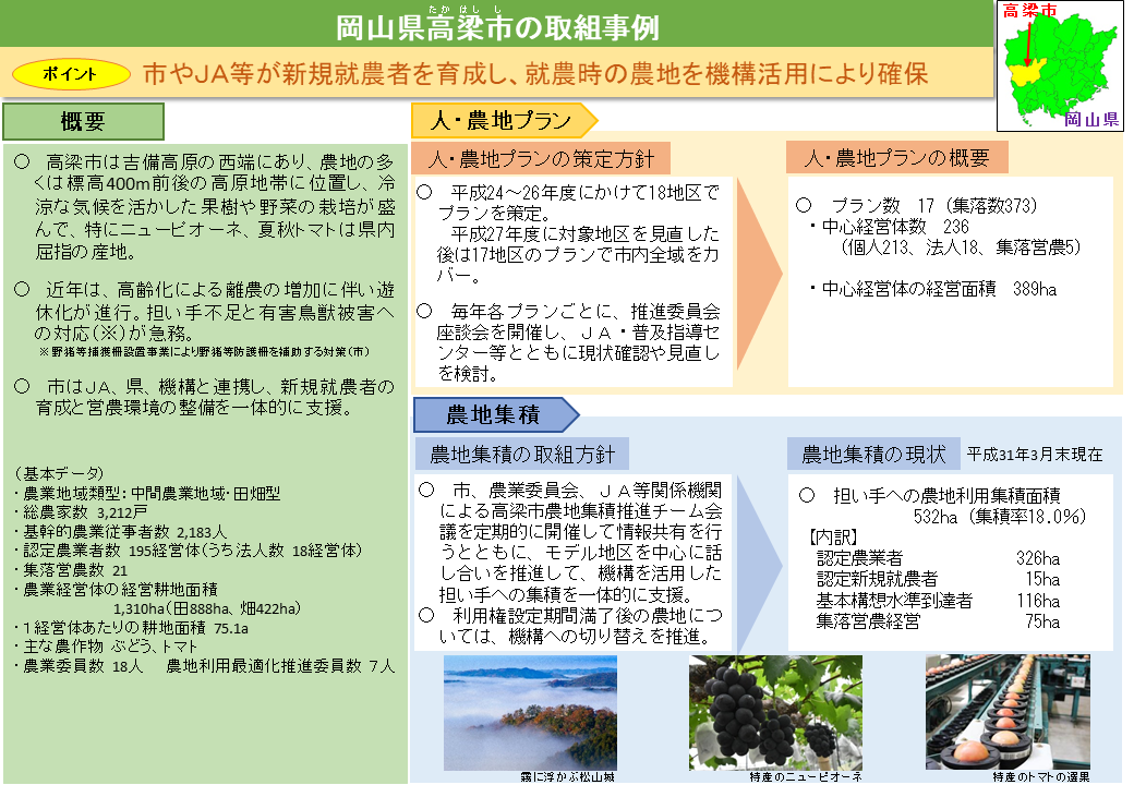 | 岡山県 | 高梁市 | 市やJA等が新規就農者を育成し、就農時の農地を機構活用により確保 | ![]() 取組事例(PDF : 287KB) |