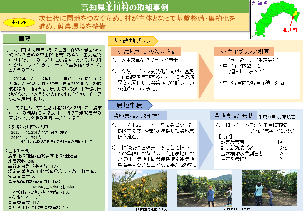 | 高知県 | 北川村 | 次世代に園地をつなぐため、村が主体となって基盤整備・集約化を進め、就農環境を整備 | ![]() 取組事例(PDF : 441KB) |