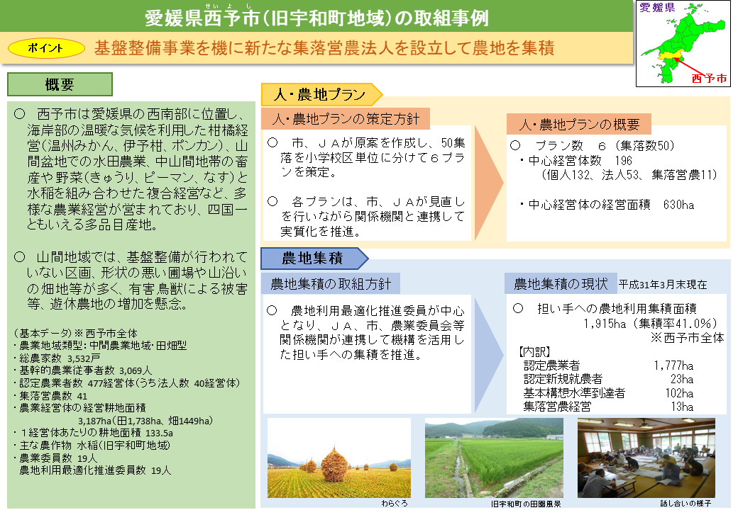 | 愛媛県 | 西予市 | 基盤整備事業を機に新たな集落営農法人を設立して農地を集積 | ![]() 取組事例(PDF : 278KB) |