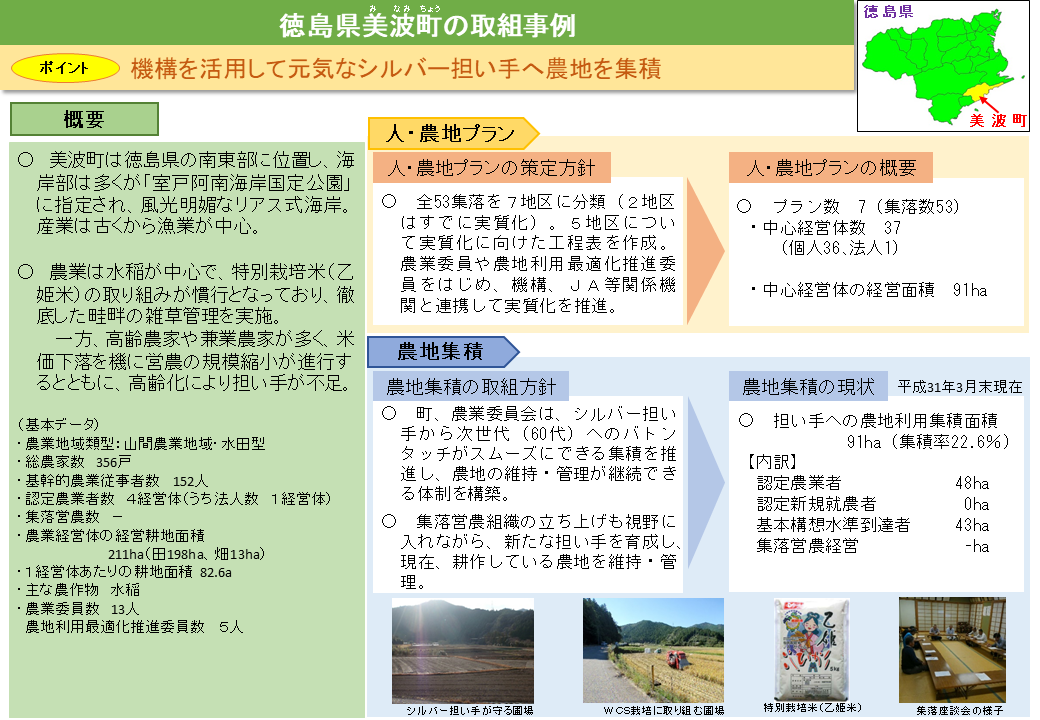 | 徳島県 | 美波町 | 機構を活用して元気なシルバー担い手へ農地を集積 | ![]() 取組事例(PDF : 230KB) |