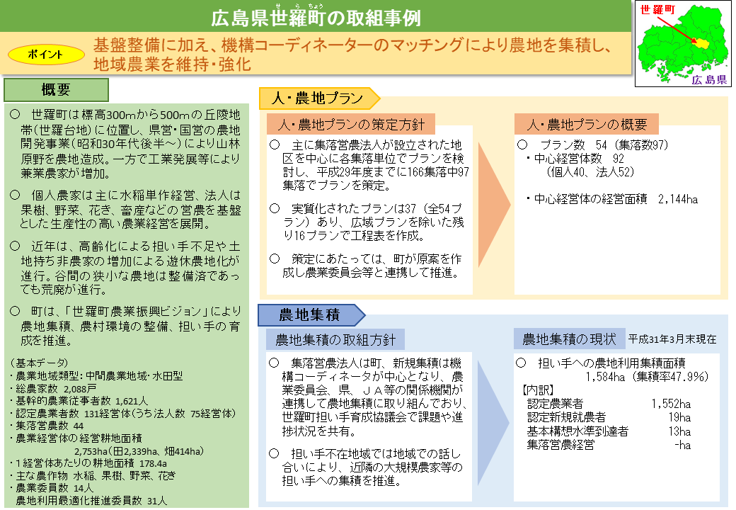| 広島県 | 世羅町 | 基盤整備に加え、機構コーディネーターのマッチングにより農地を集積し、地域農業を維持・強化 | ![]() 取組事例(PDF : 241KB) |