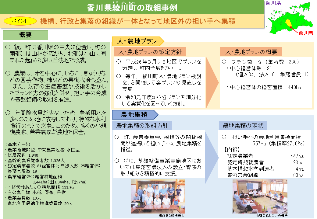 | 香川県 | 綾川町 | 機構、行政と集落の組織が一体となって地区外の担い手へ集積 | ![]() 取組事例(PDF : 293KB) |