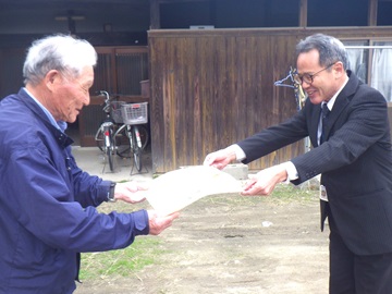 愛媛県拠点では、農業経営統計調査を15年の永きにわたり御協力いただいている、松山市の松岡仁志紀さんを訪問し、須田地方参事官から農林水産大臣感謝状を伝達し感謝の意を伝えました。