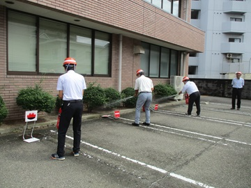 訓練では、各担当の役割分担を確認した上で、実際に非常ベルを鳴らし通報訓練と避難誘導訓練を行い、その後、訓練用消火器を使った消火訓練を行いました。