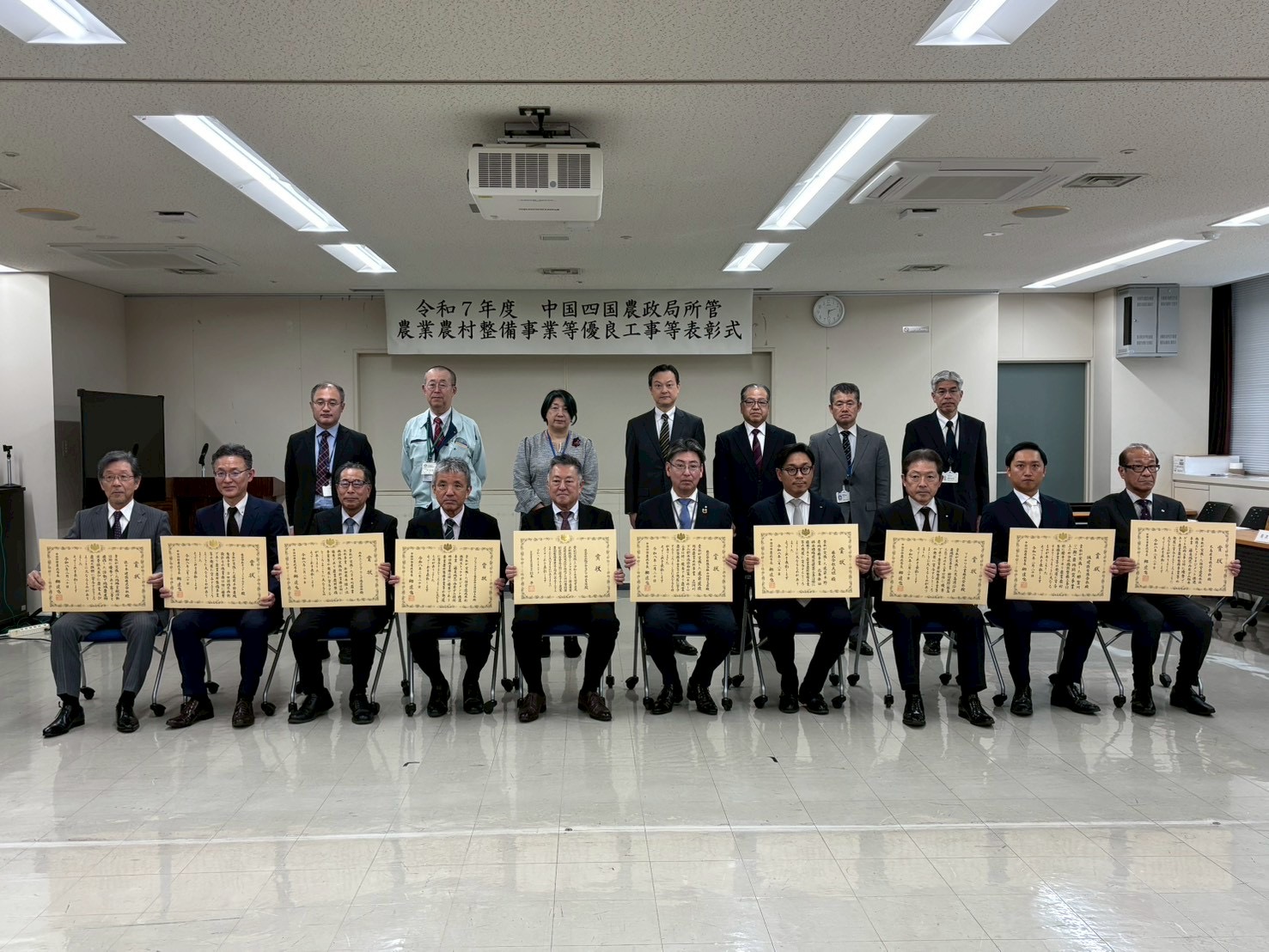 今年度は、農村振興局長表彰として優良業務1件、中国四国農政局長表彰として優良工事5件、優良業務3件、地域貢献活動1件が受賞され、中国四国農政局長から賞状が授与されました。