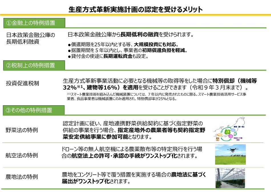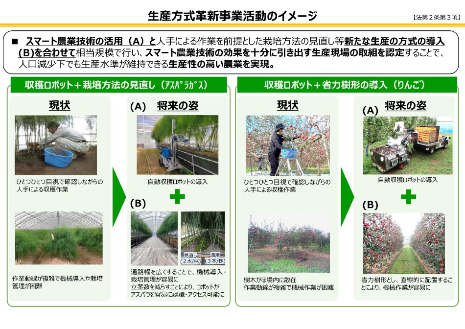 スマート農業技術の活用と農産物の新たな生産方式の導入をセットで行うことで、農業の生産性を相当程度向上させる事業活動