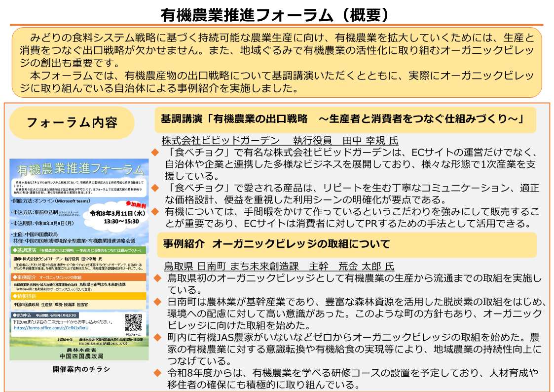 中国四国農政局では、流通支援に取り組む事業者の最新動向やオーガニックビレッジの取組・課題を共有し、地域ぐるみでの有機農業推進と更なる発展を目的に令和8年3月11日(水曜日)に有機農業推進フォーラムをオンライン形式で開催し、生産者、生産者団体、消費者、行政関係者など、86名が参加されました。