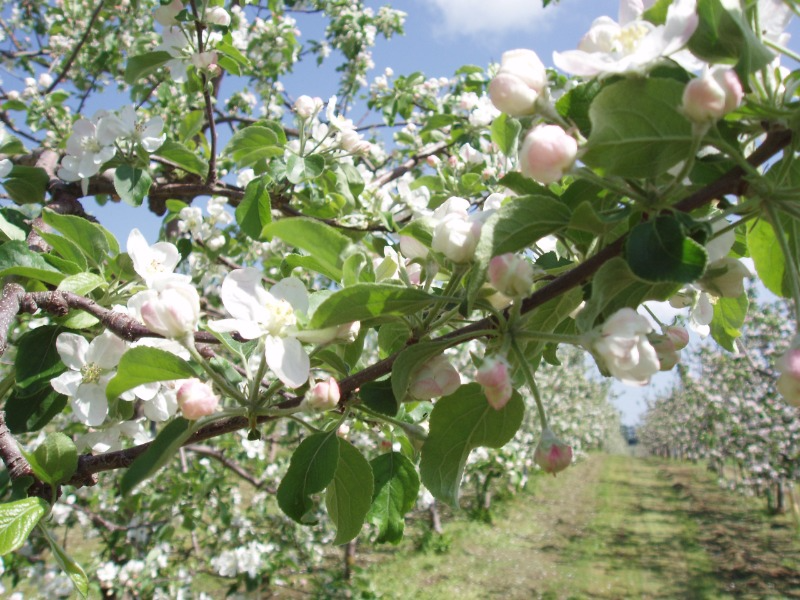七飯町のみやご果樹園では、りんごの花摘み作業が行われており、圃場ではきれいな花が咲いています。