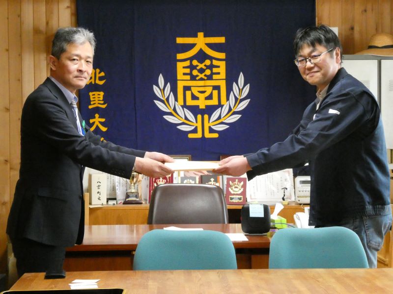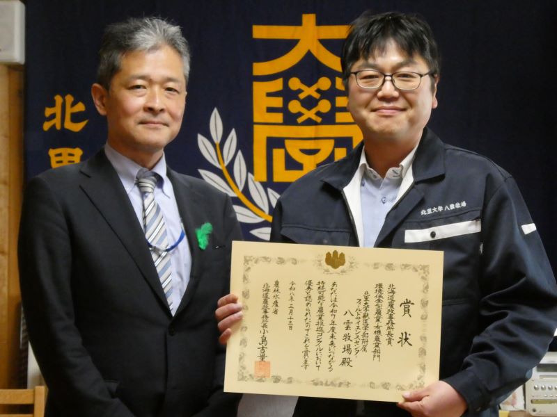 令和7年度は、函館地域拠点管内の北里大学獣医学部附属フィールドサイエンスセンター八雲牧場(以下、北里大学八雲牧場という。)が、北海道農政事務所長賞に選定されたことから、4月17日に当地域拠点地方参事官から北里大学八雲牧場の小笠原講師に表彰状を贈呈しました。