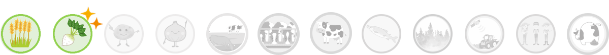 てんさい(甜菜)の別名はサトウダイコン(砂糖大根)。確かに、根の形はカブやダイコンに似ているね!でも、カブやダイコンの仲間ではなく、ホウレンソウの仲間なんだ。大きく育った根の部分は1kgにもなり、1kgのてんさいから約160gの砂糖がとれるよ。