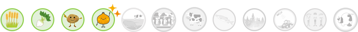 私(わたし)たちが食(た)べているのは、たまねぎの「葉(は)」の部分(ぶぶん)なんだ! 土(つち)の中(なか)に埋(う)まっているから、「根(ね)」の部分(ぶぶん)を食(た)べていると思(おも)ったかな?食(た)べているのは葉(は)の根元(ねもと)の膨(ふく)らんだ部分(ぶぶん)で、成長(せいちょう)するにしたがって厚(あつ)みをまして、重(かさ)なり合(あ)って球体(きゅうたい)のように太(ふと)っていくよ。