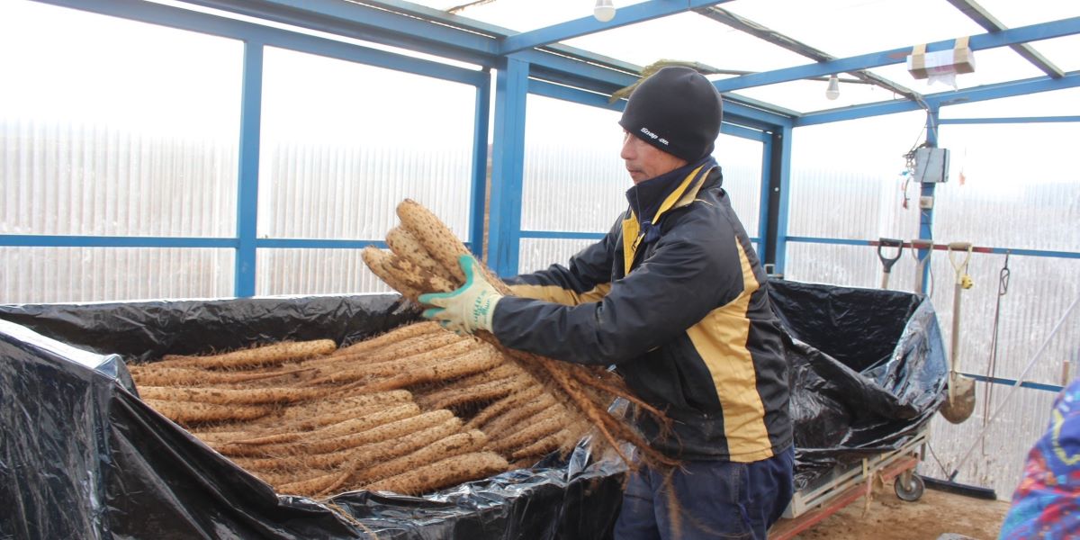 11月上旬、長いもが収穫の時期を迎えました。掘り上げられた長いもは形状別にコンテナに入れ選果場へ運びます。