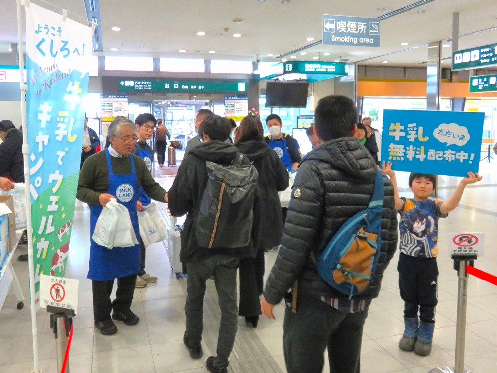 牛乳を受け取った到着客からは、「釧路には初めて来たが、牛乳で歓迎してもらえて嬉しい。これから道東を旅行するが、色々な牛乳を飲んでみたい」との声がありました。