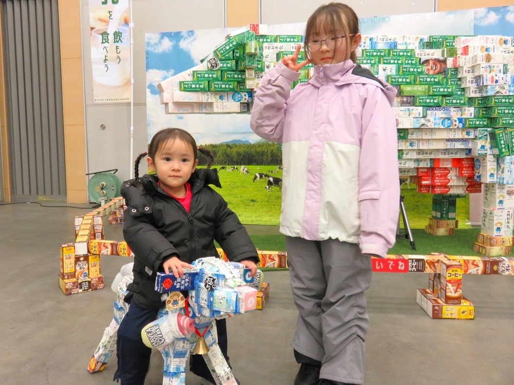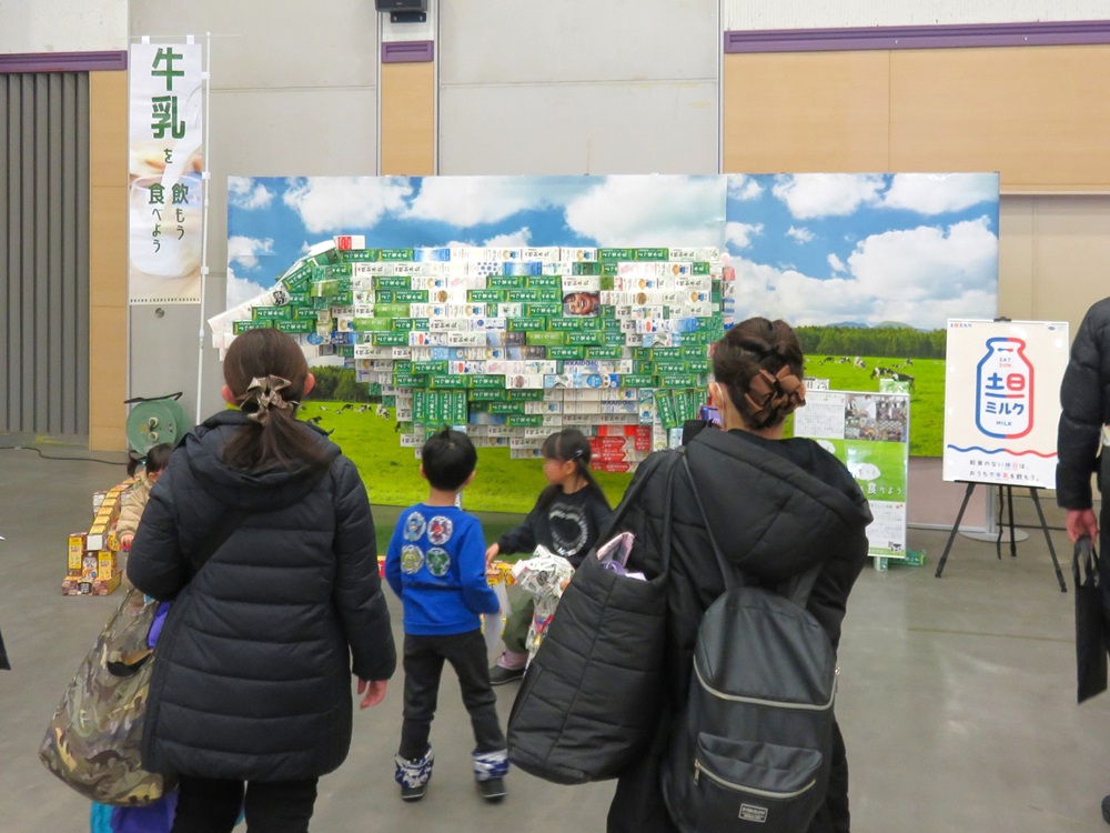 牛乳消費拡大を呼びかけるコーナーでは、釧路地域拠点が制作した牛乳パック製のジャンボ牛と子牛を展示し、子牛にまたがって記念撮影を楽しむ子どもや家族連れで賑わいました。