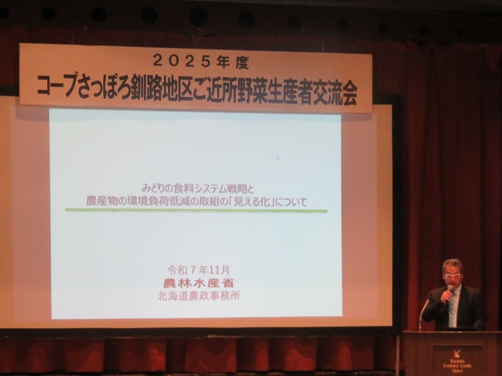 釧路地域拠点では、11月25日に開催された「2025年度コープさっぽろ釧路地区ご近所野菜(※1)生産者交流会」において、みどりの食料システム戦略(※2)及び農産物の環境負荷低減の取組の「見える化」(※3)について、説明しました。