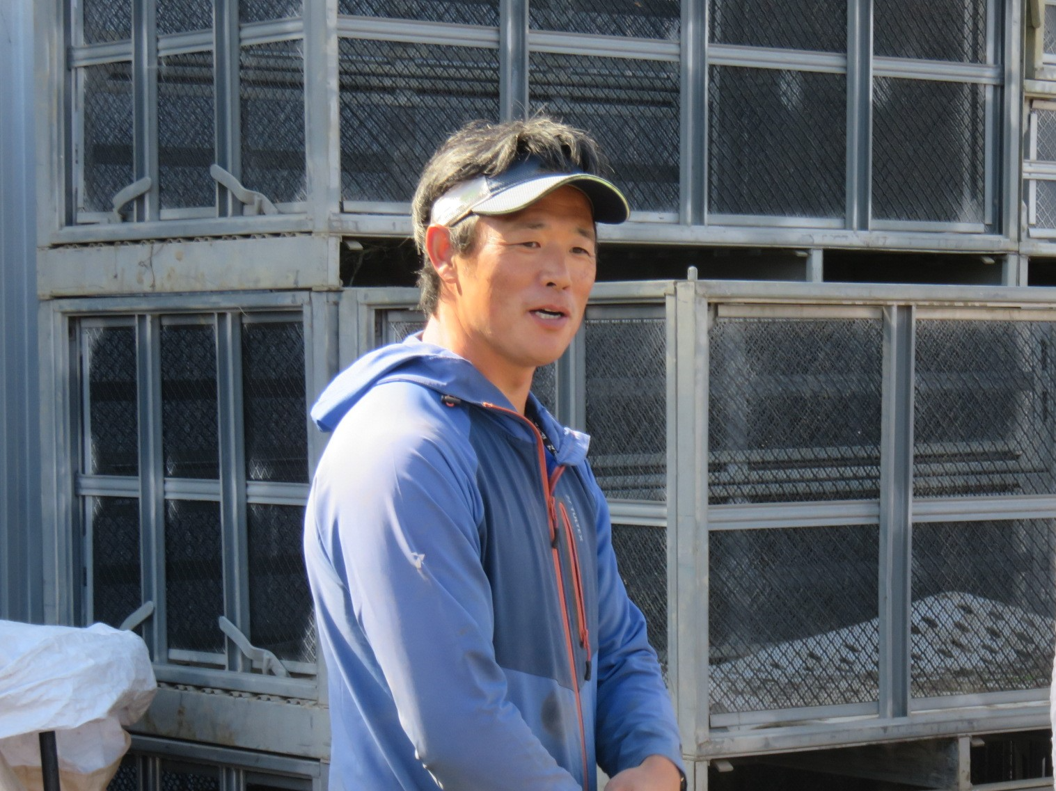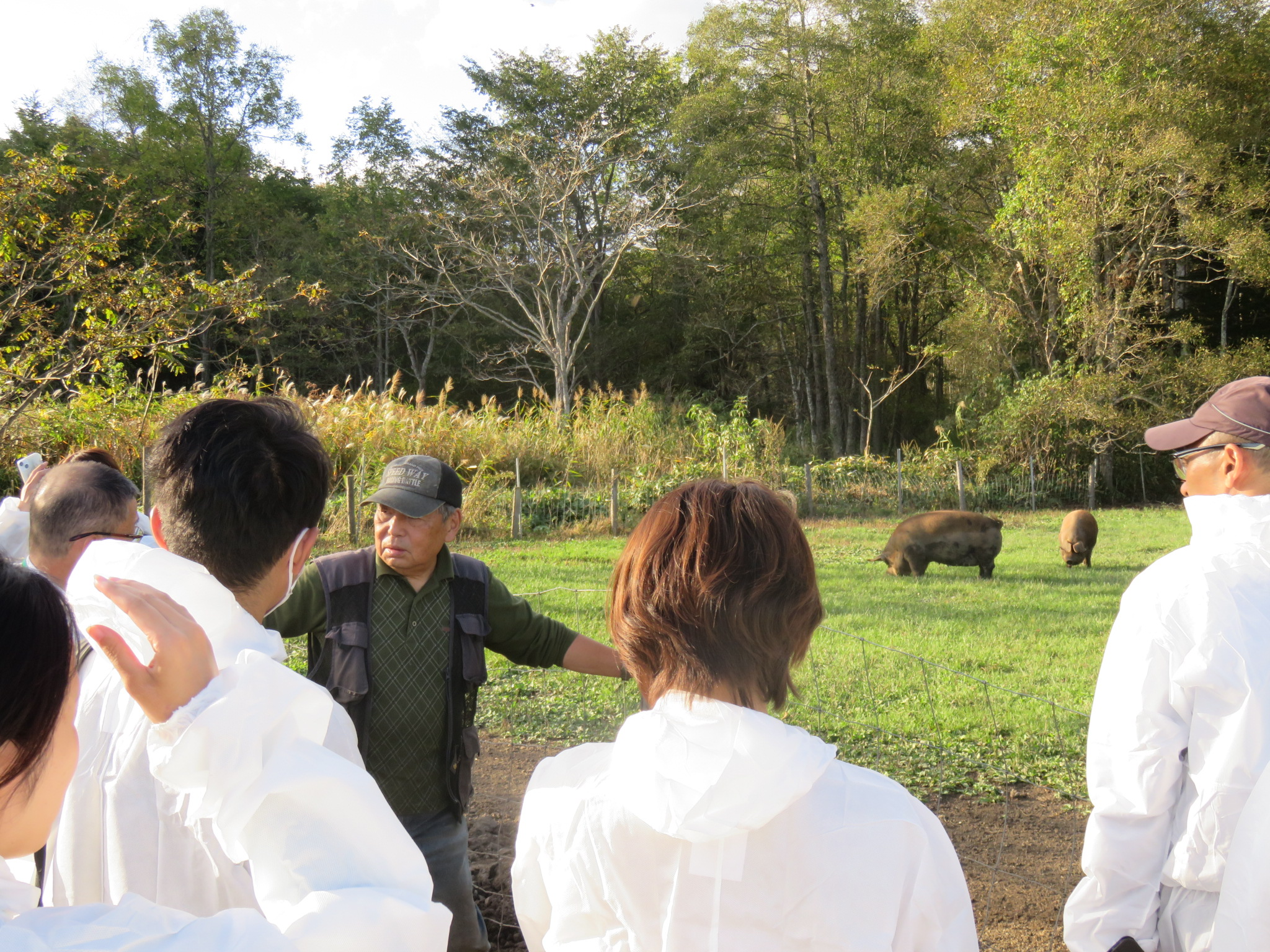 遊牧舎の放牧場で秦氏(中央)の説明を聞く参加者