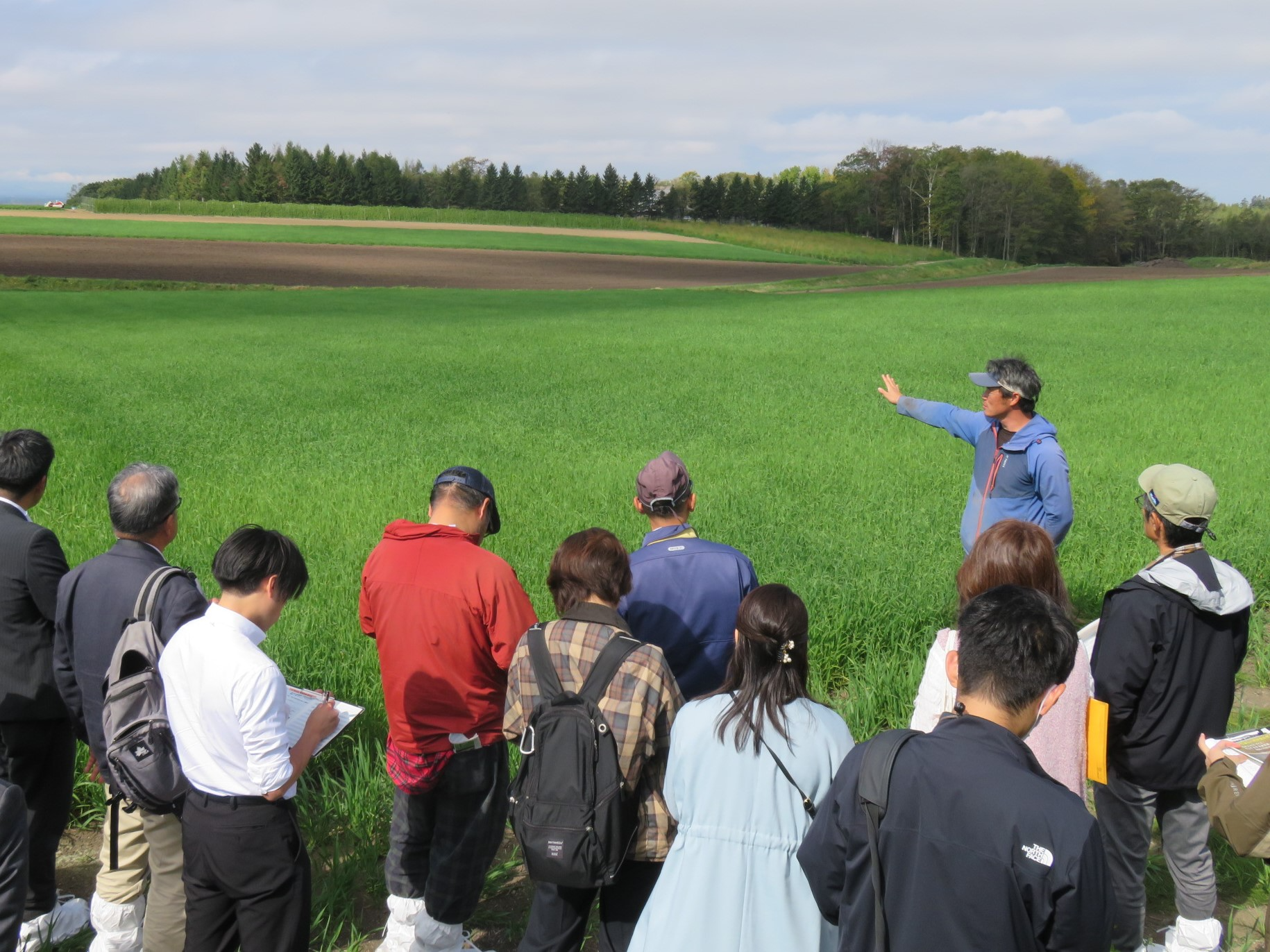 斎藤農場で有機栽培の説明を聞く参加者
