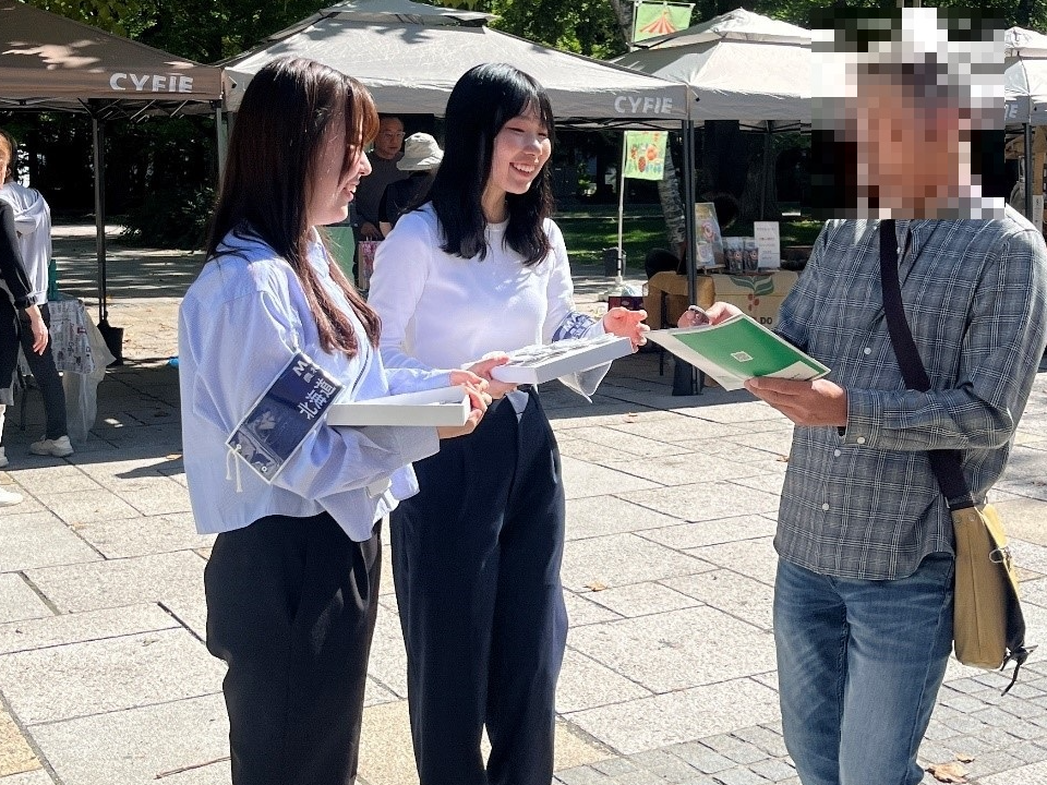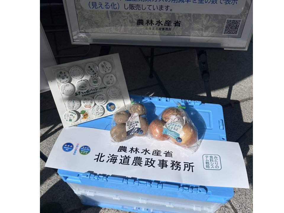 令和7年8月30日、31日、9月27日、28日の4日間は、札幌市の中島公園で開催された中島公園エシカルマルシェに出展しました。展示ブースでは、「みどりの食料システム戦略」に関するパネルや「みえるらべる」を貼った野菜を展示するとともに、職員から来場者に対して、環境に配慮した農産物を積極的に選択することや、食品ロス削減等の取組の重要性について紹介しました。また、日ごろからみどり戦略を意識してもらえるように、みどり戦略の啓発缶バッジを製作して来場者に配布しました。