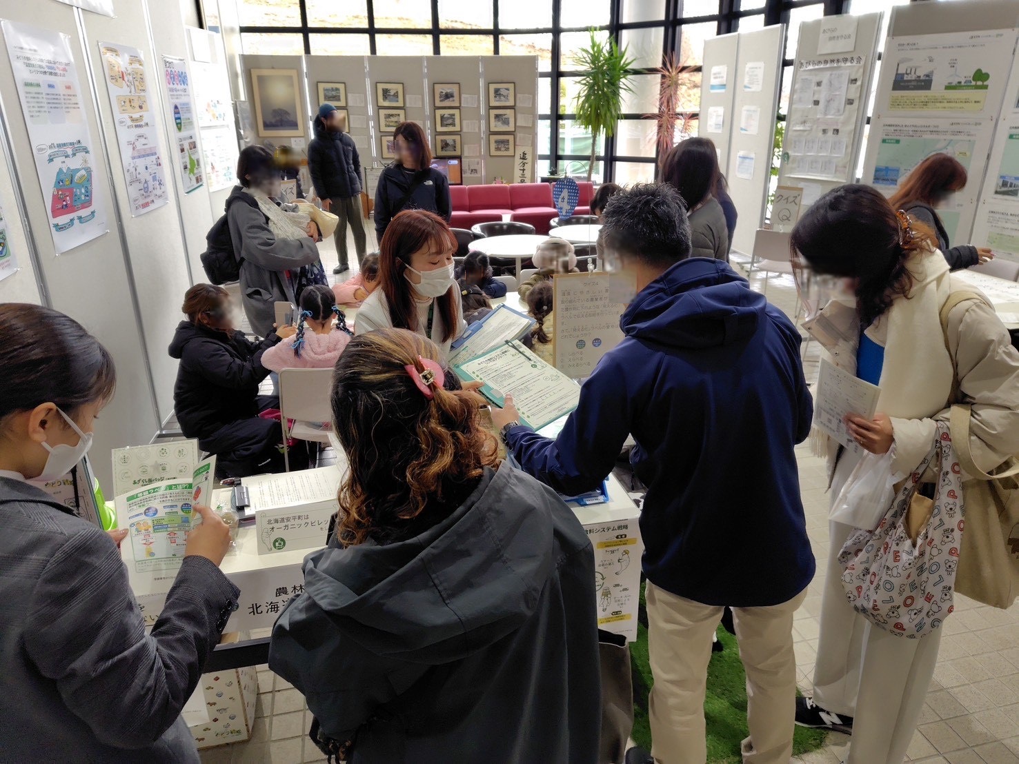 令和7年11月8日は、安平町の追分公民館で開催されたあびらオーガニックフェスタ2025に出展しました。出展ブースでは、みどり戦略に関するポスターや「みえるらべる」を貼った野菜の展示を行うとともに、規格外野菜からつくられた「おやさいくれよん」を使用したぬりえを体験してもらい、子どもを中心に 幅広い世代の方々に楽しく学んでいただく機会を提供しました。また、日頃からみどり戦略を意識してもらえるように、ガチャガチャを活用してみどり戦略の啓発缶バッチを来場者に配布しました。