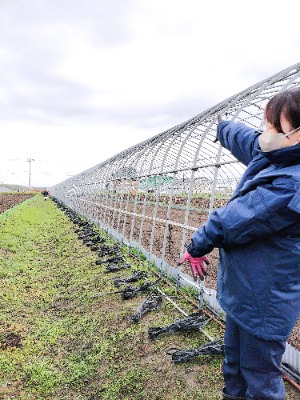【農業用マルチシートの留め具を抜く作業(ハウス内のインゲン畑にて)】