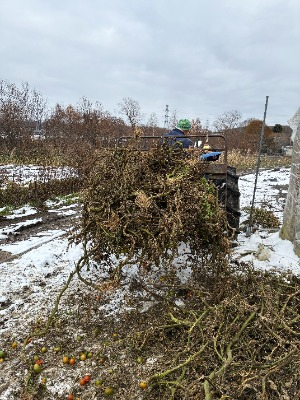 【抜根されたトマトの茎や葉をトラクターで運ぶ様子】