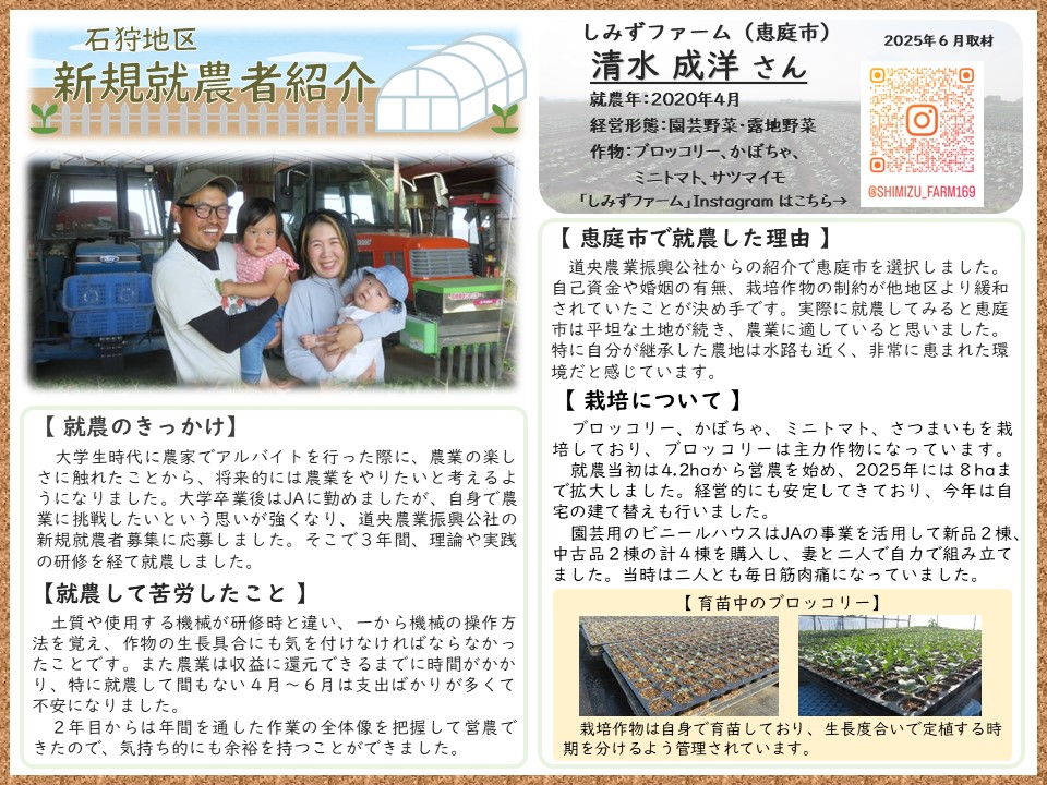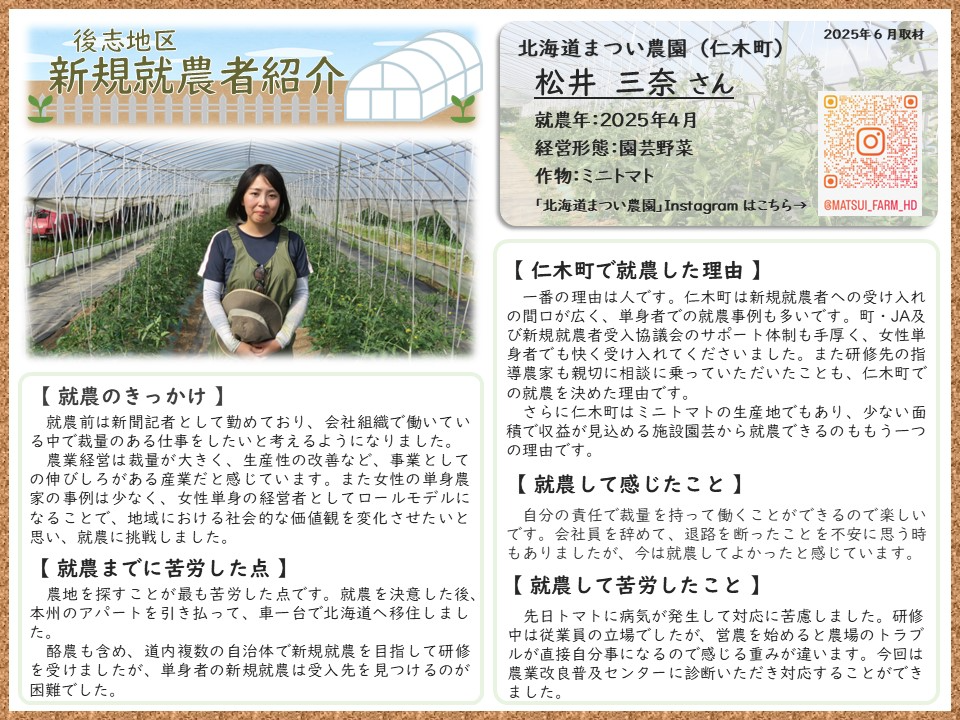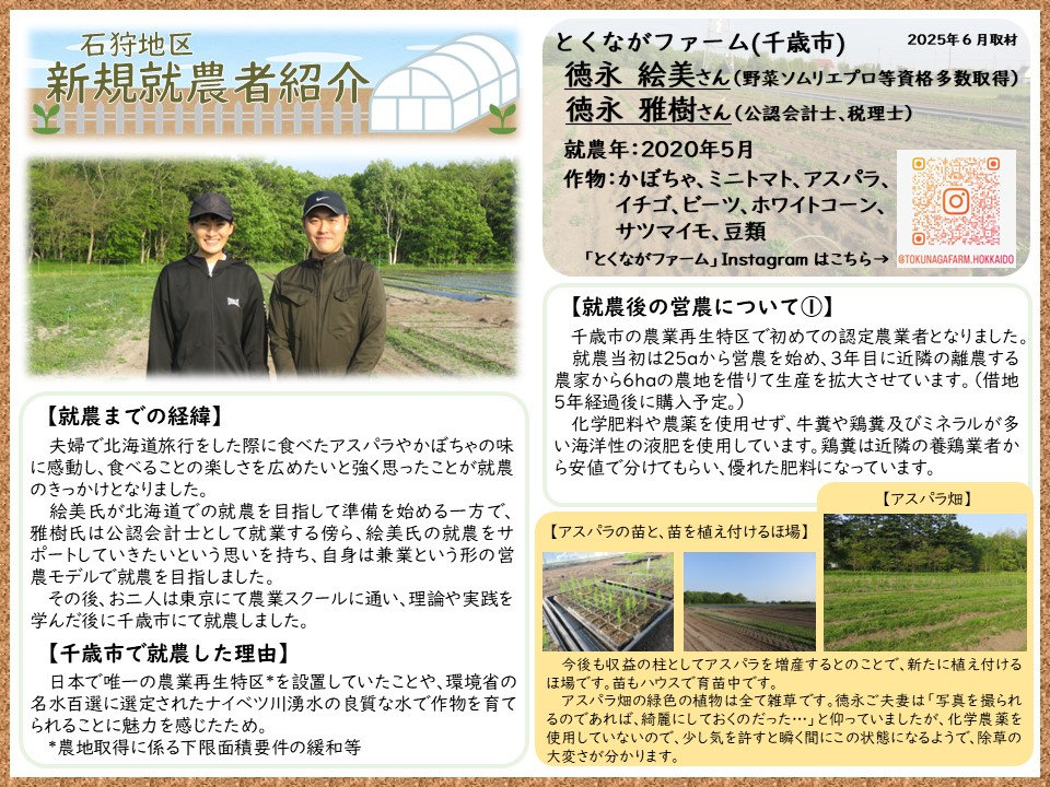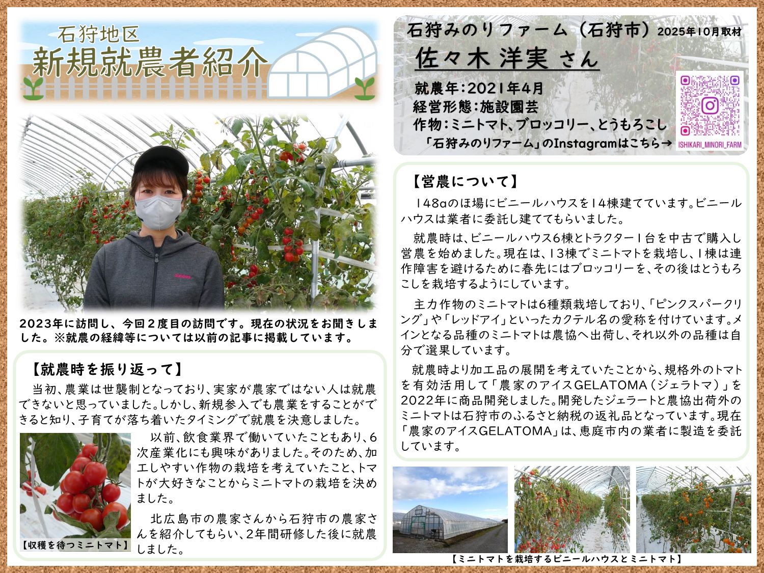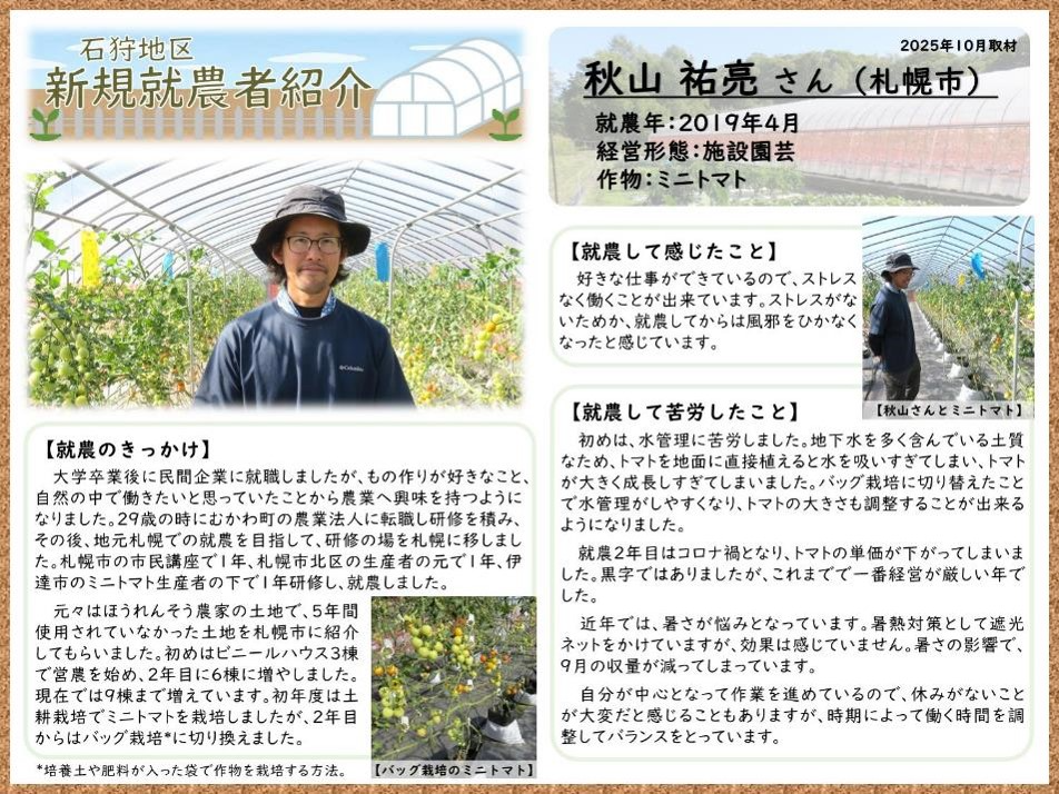 北海道農政事務所札幌地域拠点では、新規就農を目指す方や就農して間もない方への情報提供のひとつとして、札幌地域拠点管内の新規就農者の方から農業をはじめたきっかけ、やりがい、苦労したことなどについてお話をお伺いしています。