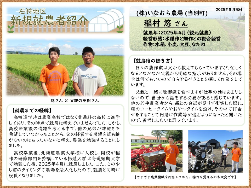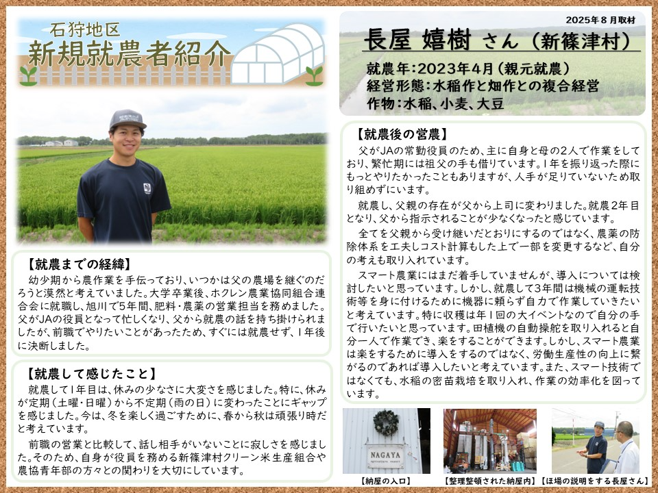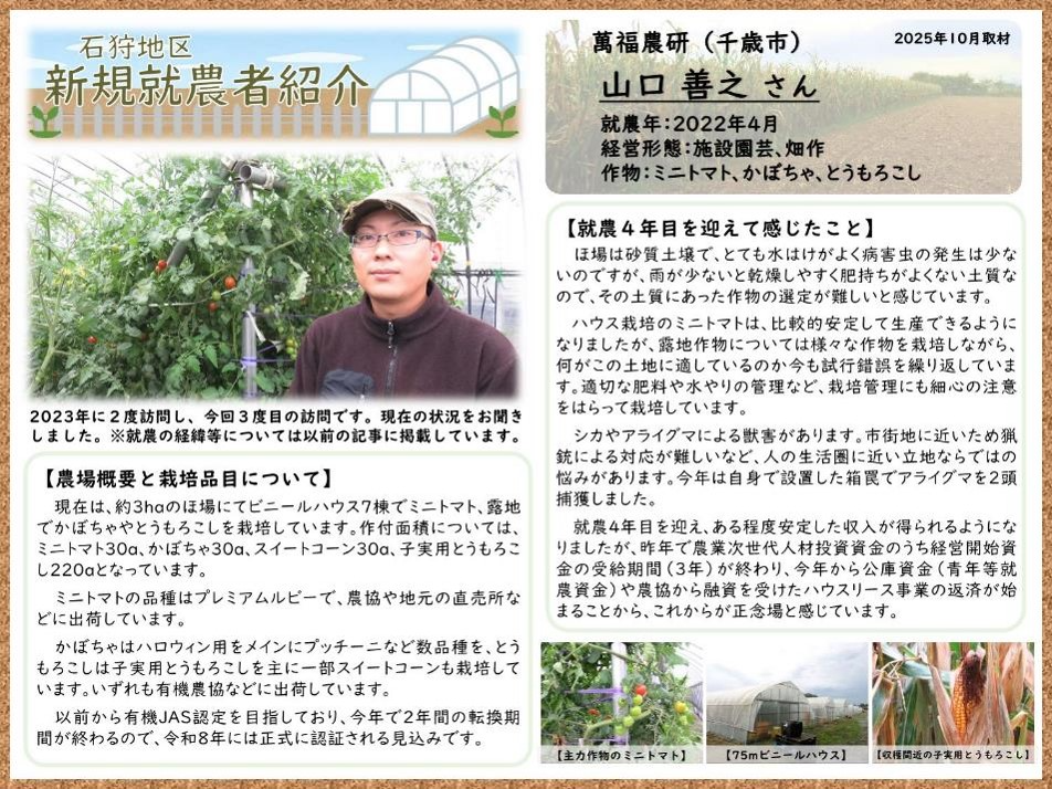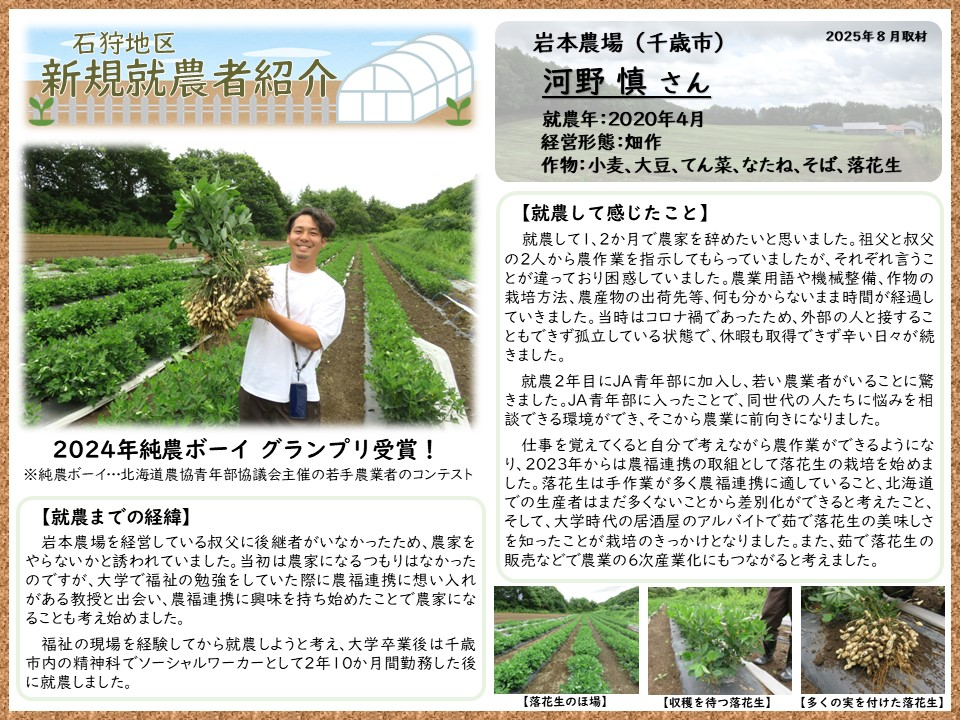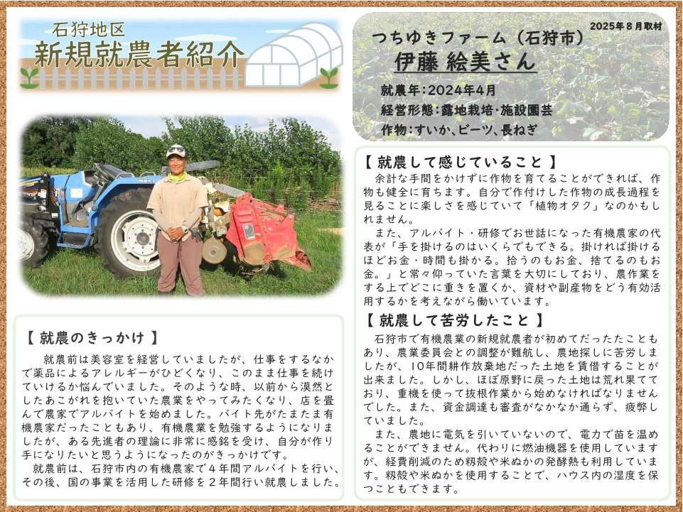 北海道農政事務所札幌地域拠点では、新規就農を目指す方や就農して間もない方への情報提供のひとつとして、札幌地域拠点管内の新規就農者の方から農業をはじめたきっかけ、やりがい、苦労したことなどについてお話をお伺いしています。