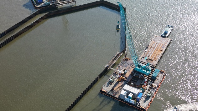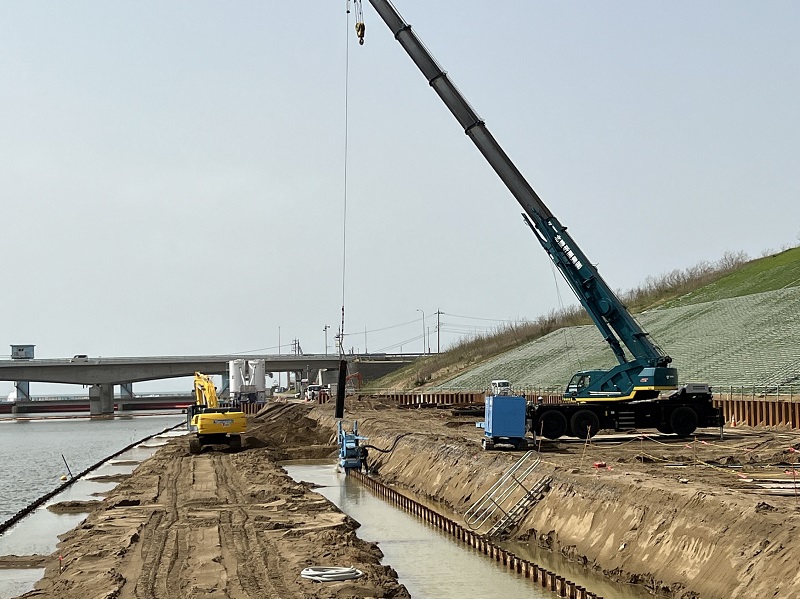 河川内:仮締切工の鋼矢板打設を実施中