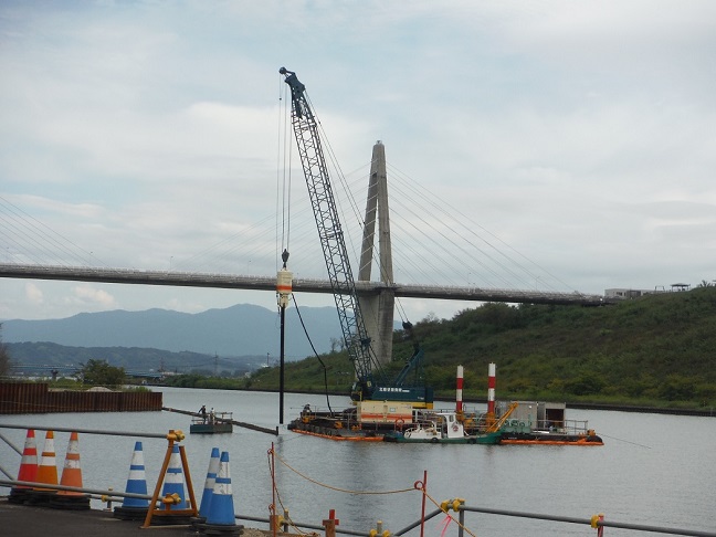 河川内:河床堆積土対策工にて深層混合処理工を実施中