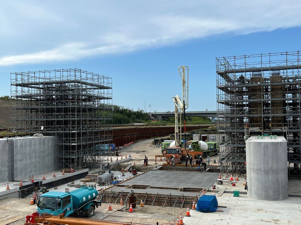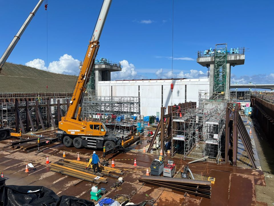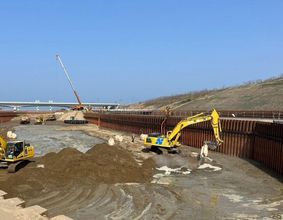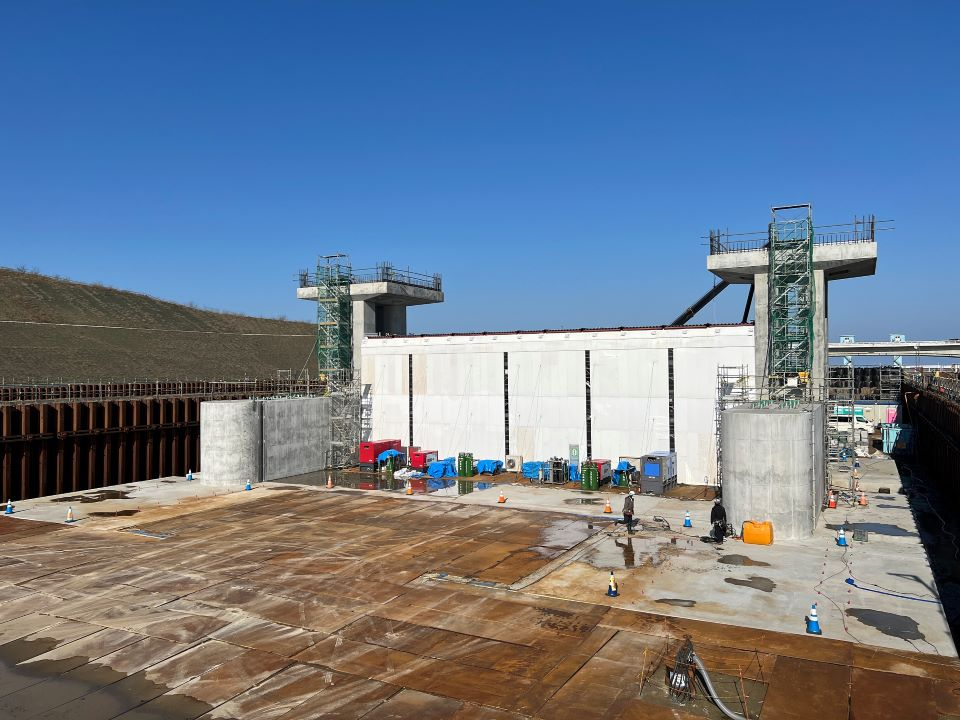 右岸:仮廻し水路工にて地盤改良(中層混合処理)、