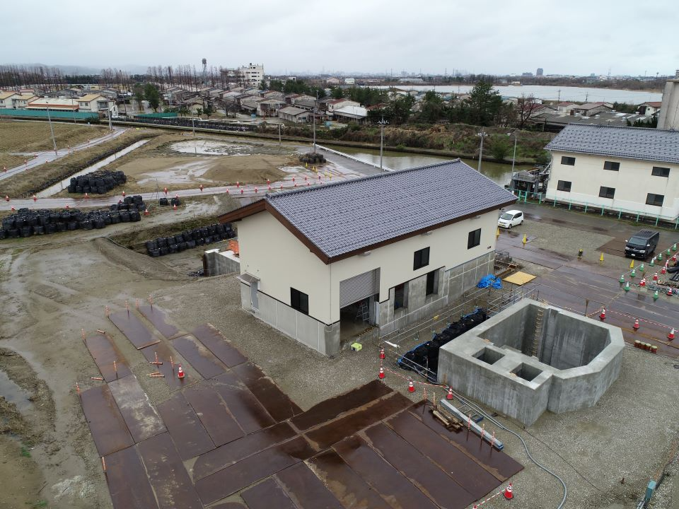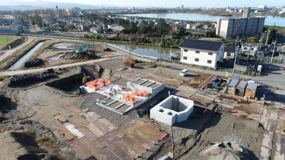 八田排水機場 仮締切撤去(排水樋門部)、鉄筋組立(機場本体部)を実施中