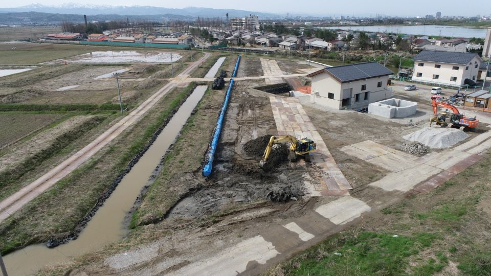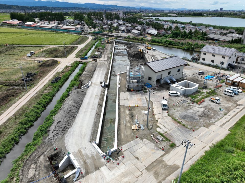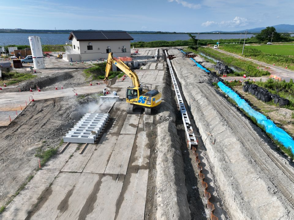 八田排水機場 築堤盛土・堤外水路(排水樋門部)、鉄筋組立(機場本体部)を実施中