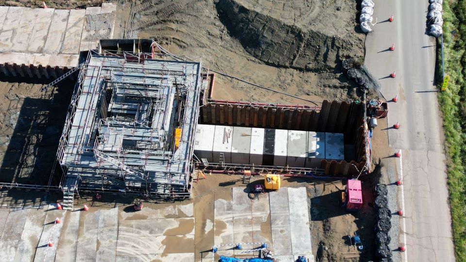 樋管部据付完了、仮設工のうち機場本体部土留工を実施中