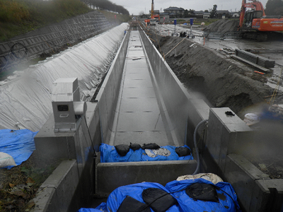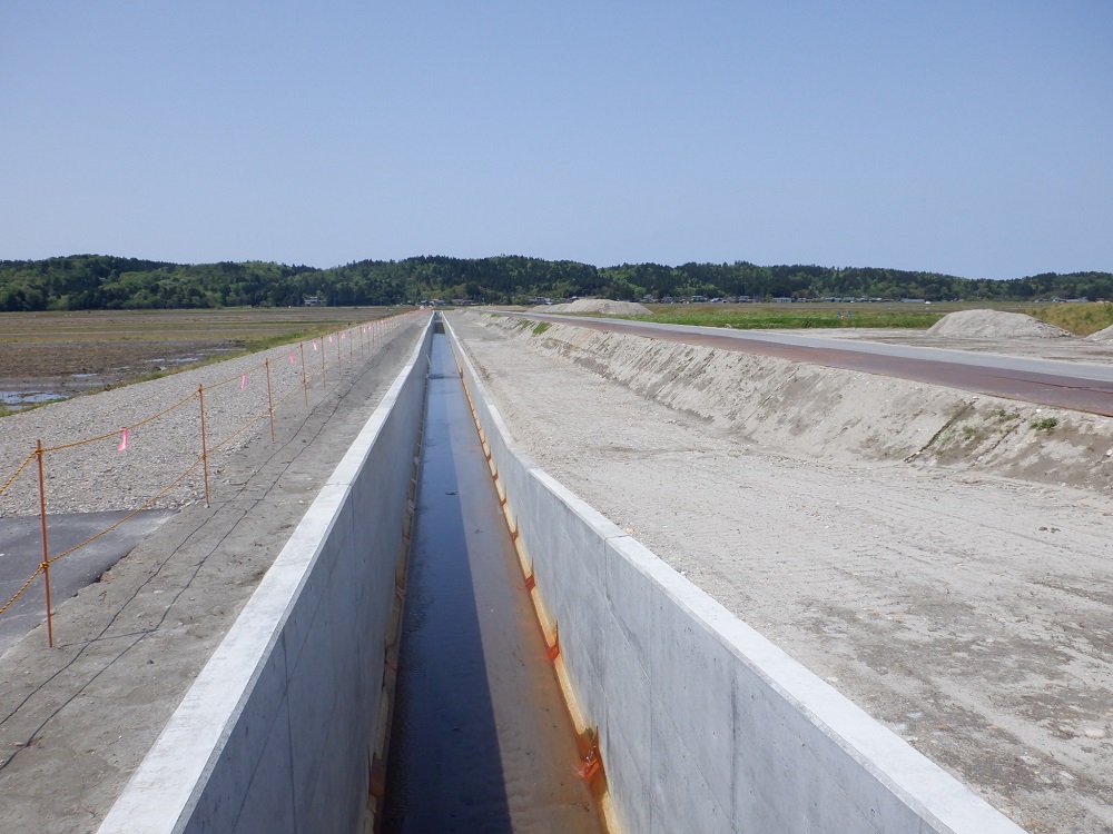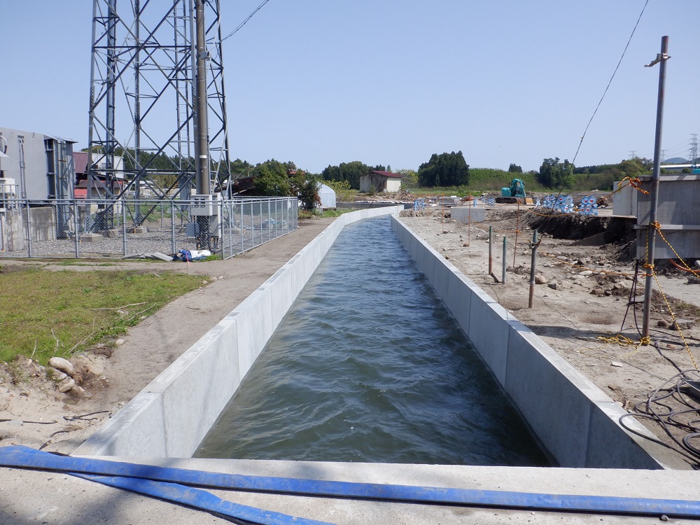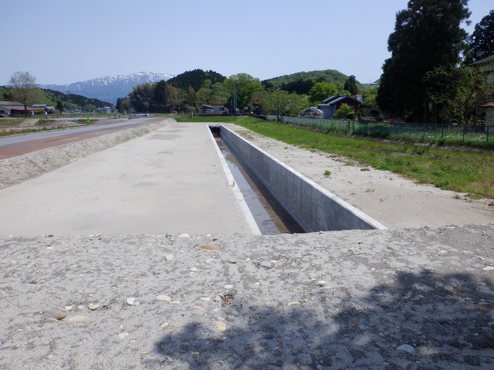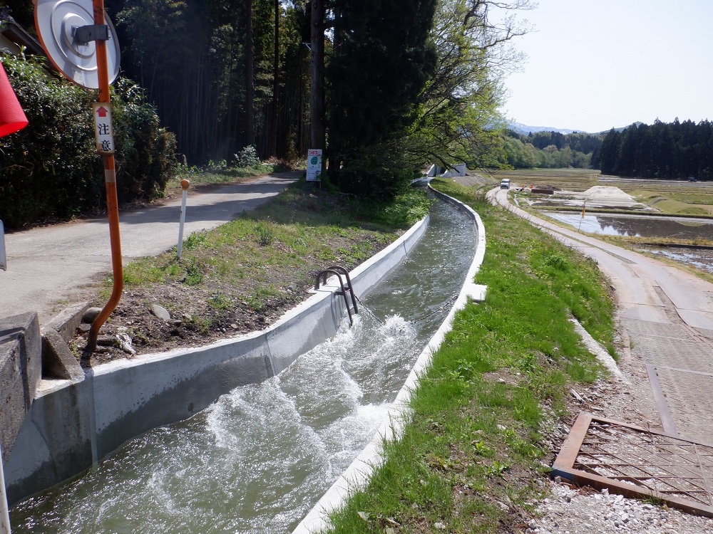 令和4年度より、県道202号線、市道小戸線の横断部と宮古木分水工までの最下流部水路の改修工事に着手し、令和5年4月から通水を開始、同年6月には全線の改修を完了しました。