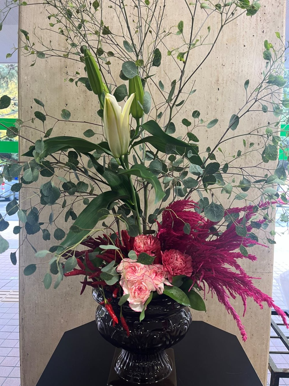北陸農政局では、2027年(令和9年)3月から開催されるGREEN×EXPO2027について多くの方に関心をもっていただくとともに、これを契機として北陸地域の花き園芸産地を知っていただき、管内の花き園芸振興につなげるため主に北陸地域で生産された花等を使ったフラワーアレンジメントを合同庁舎入口に展示しています。 来庁の際はぜひご覧ください。