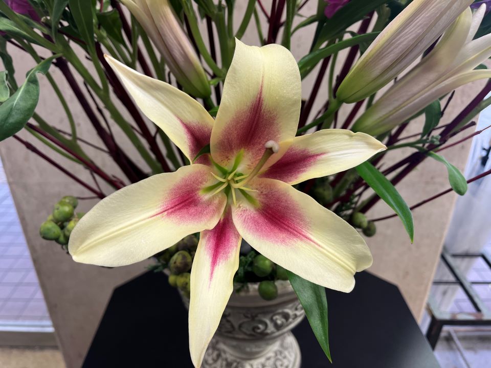 北陸農政局では、2027年(令和9年)3月から開催されるGREEN×EXPO 2027について多くの方に関心をもっていただくとともに、これを契機として北陸地域の花き園芸産地を知っていただき、管内の花き園芸振興につなげるため主に北陸地域で生産された花等を使ったフラワーアレンジメントを合同庁舎入口に展示しています。 来庁の際はぜひご覧ください。