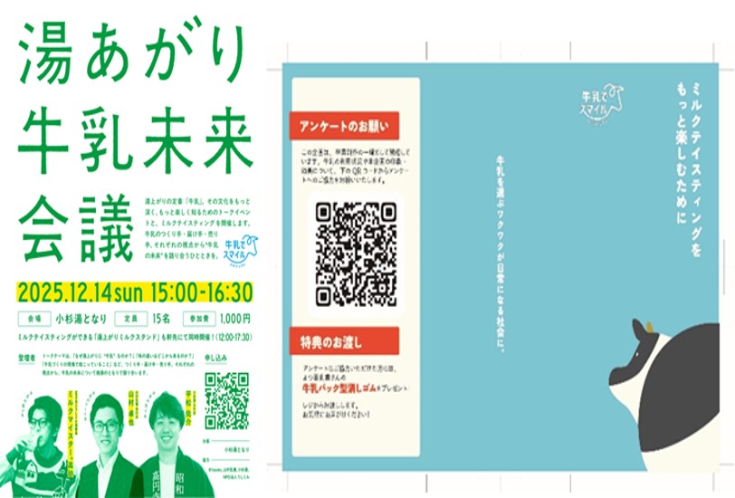 日時:2025年12月14日 内容:「小杉湯となり」、「よつ葉乳業」協力のもと、銭湯付きシェアスペースで乳脂肪分による味の違いをテーマにしたトークショーと牛乳の飲み比べを開催。イベントのリーフレット等にロゴを使用。 |