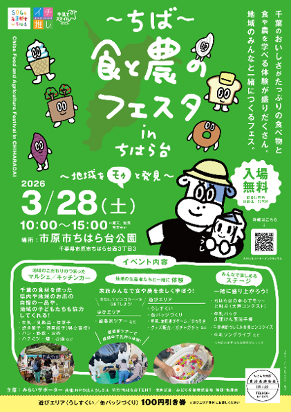 日時:2026年3月28日 内容:千葉県市原市で開催されるイベント「ちば食と農のフェスタin ちはら台」の告知用チラシや、ウェブサイト、SNSなどでロゴを使用。 |