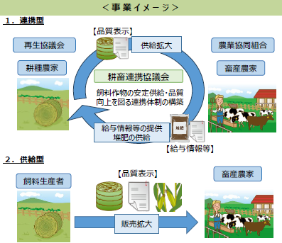 農林水産省では都道府県と連携し、飼料作物の耕種農家の供給と畜産農家の需要とを結び付けています。