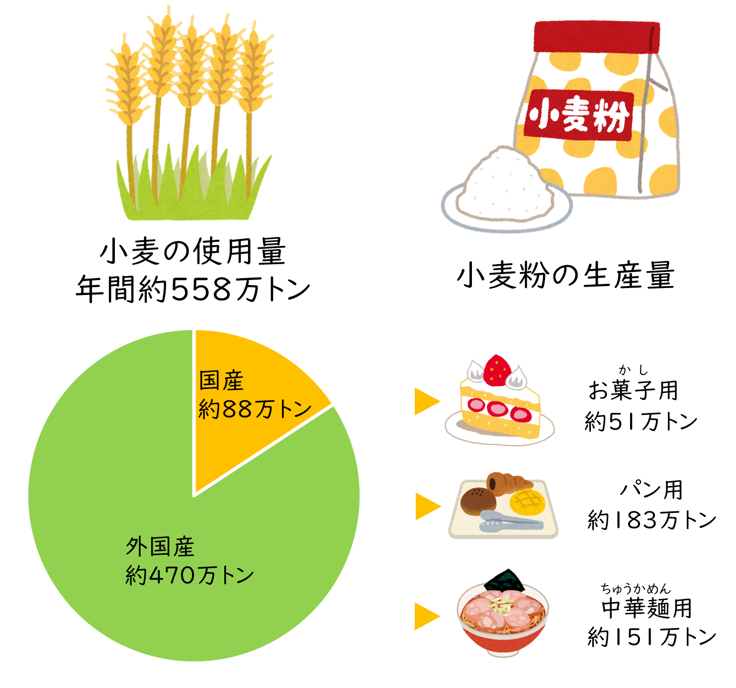 日本の小麦の使用量は年間約558万トンで、そのうち外国産が約470万トンです。外国産の輸入小麦は主要生産国の生産状況に影響を受けます。例えば、日本が1番小麦を輸入しているアメリカで異常気象があって生産量が減ると、価格が上がってしまいます。そうなるとパンの生産コストにも影響があります。ちなみに、パン用小麦粉の生産量は約183万トン、お菓子用小麦粉の生産量は約51万トン、麺用小麦粉の生産量は約151万トンです(令和4年度)。