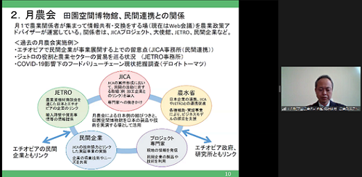 「TICAD8に向けた協力事業の検討」では、約160名の参加を得て、本年8月に開催が決定した第8回アフリカ開発会議(TICAD8)に向けて、アフリカの農業・食料を巡る課題や農林水産省の取組を紹介した他、TICAD8の準備状況や関係政府機関の活動状況について紹介がありました。その後、エチオピアにおける官民連携の事例や、日本企業等の皆様の取組をご紹介いただき、今後のアフリカ各国との協力や現地ビジネスの展開への方策の議論を行いました。