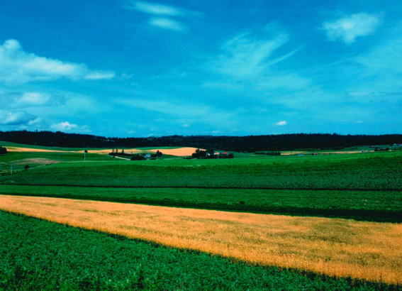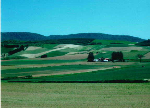 地域の東部に広がる広大な丘陵地のほ場に作付けされた作物は、それぞれの収穫時期を色彩豊かに表現し、美しい実りの景観を提供しています。