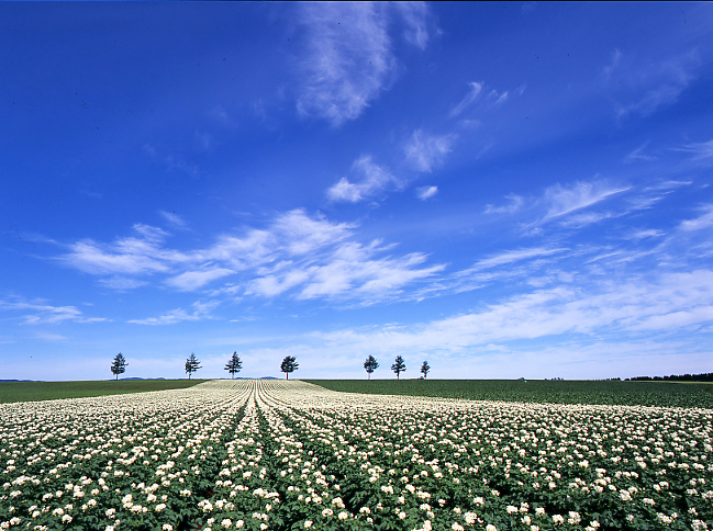 北海道東部のオホーツク海側に広がる丘陵地帯は広大な畑地と風雪から大地を守る防風林、その背後に広がる山並みや海とのバランスが美しく、7月~8月にはばれいしょの白や薄紫の花・麦類の黄色・てんさいの緑・オホーツク海や空の青とが一体となった景観、秋には花開く緑肥用ヒマワリと豊穣の大地が織りなす四季折々の農村景観を楽しむことが出来ます。