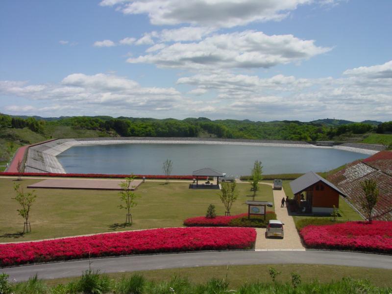 公園の展望台からは、農業用のため池「芳那の水晶湖」の青い水面と八溝山系の緑の山々が一望できます。